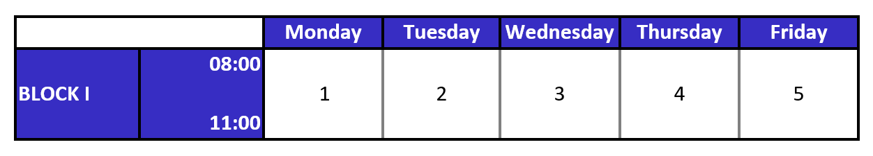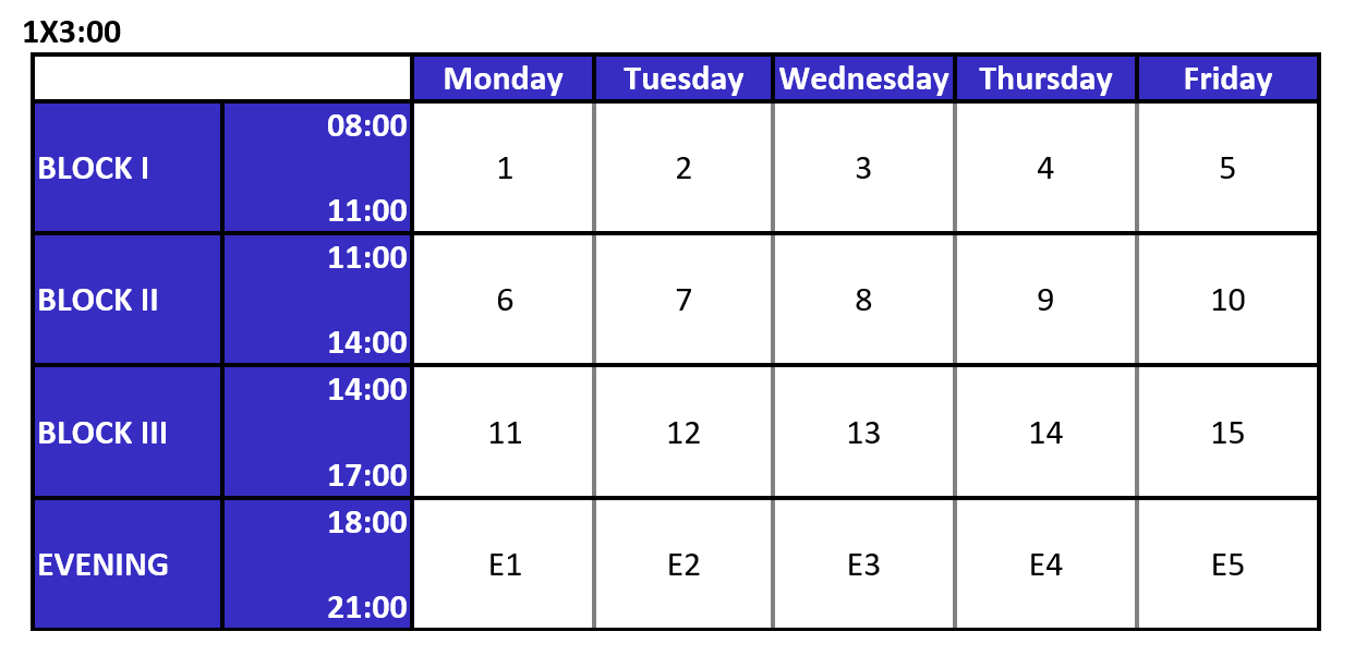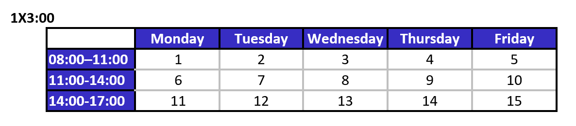 Si nous poursuivons avec l’exemple selon lequel nos cours sont offerts en durées de 3 h, qui peuvent être divisés en 3 × 1 h, 2 × 1 h 30 ou 1 × 3 h, nous pouvons constater qu’ils s’insèrent tous dans un bloc de 3 h. Comme la plupart des horaires de jour s’échelonnent de 8 h 00 à 17 h 00 (soit une durée de 9 h), nous pouvons utiliser cette symétrie pour diviser la journée en 3 blocs de 3 h chacun et ajouter un bloc en soirée si nécessaire.