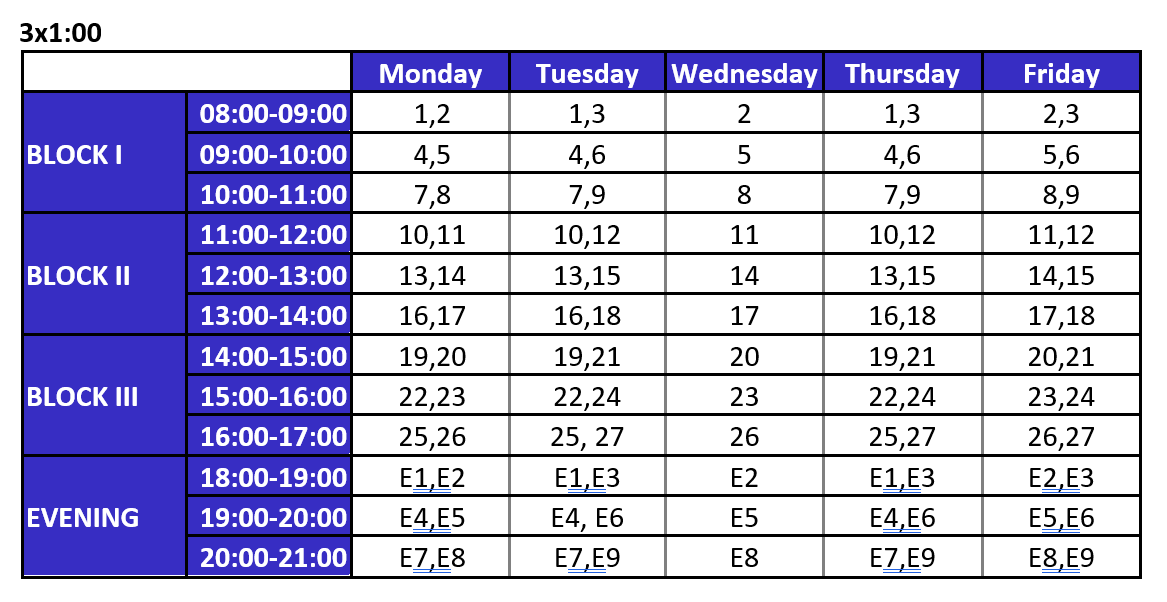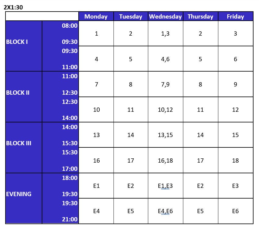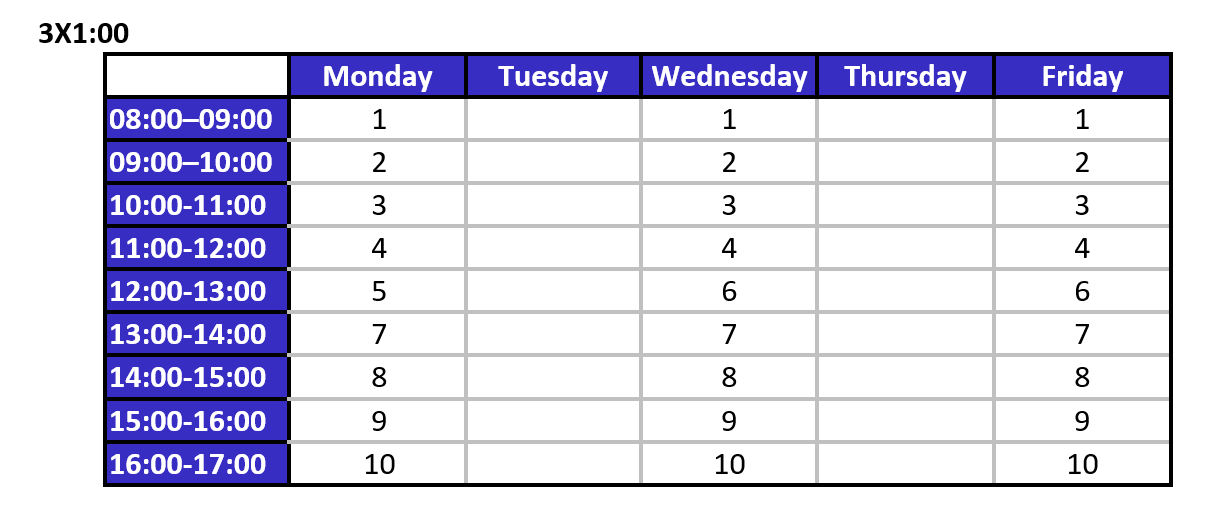 Avec ces informations, les établissements ont généralement adopté un système de trames qui assigne les cours 3 × 1 h les lundis, mercredis et vendredis et les cours 2 × 1 h 30 les mardis et jeudis. Les cours 1 × 3 h pourraient être assignés à n’importe quel moment de la semaine, pourvu qu’ils ne chevauchent pas trop d’autres trames. Une représentation sous forme de tableau serait la suivante :