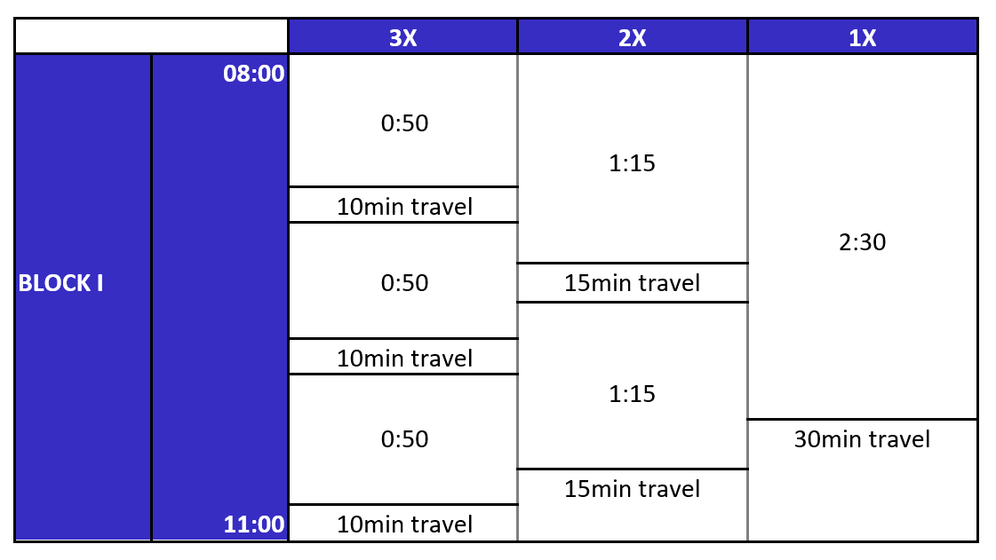 Comme l’offre de cours 3 fois par semaine est celle qui entraîne le plus de changements de cours dans un même bloc, c’est elle qui sera la plus touchée par le temps de déplacement et, par conséquent, celle qui déterminera la configuration des autres.