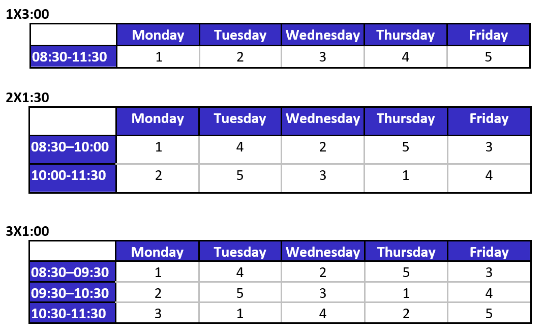 Cette trame est celle qui changera le plus. Comme elle occupe trois jours parmi les cinq jours de la semaine, elle ne peut être offerte que les lundis, mercredis et vendredis, trois fois dans un bloc, si nous maintenons l’exigence voulant qu’il y ait une journée libre entre chaque séance. Toutefois, si nous assouplissons cette règle et acceptons que deux des séances aient lieu deux jours consécutifs, alors nous avons beaucoup plus d’options. Les cours pourraient donc être offerts les lundis, mardis et jeudis, ou les lundis, mercredis et vendredis, ou encore les mardis, jeudis et vendredis. Dans un tableau, les options se présentent comme suit :