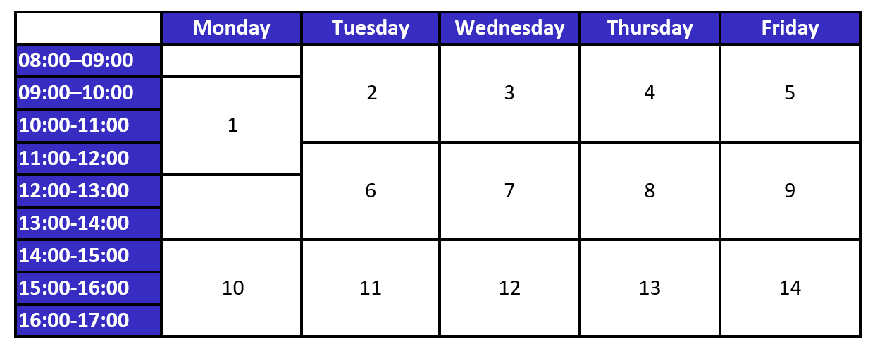 Si vous tentiez d’assigner un de ces cours de 3 h avec une heure de début décalée, il ne resterait de la place que pour 13 cours supplémentaires. Cela réduit donc le total de 15 à 14.